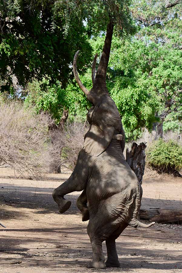 Mana Pools is also home to the world-famous elephants that exhibit a unique behavior of standing on their hind legs to reach for fruit hanging from the trees. This remarkable sight, witnessed firsthand, left me in awe of the intelligence and adaptability of these gentle giants. As they gracefully balanced on their hind legs, their trunks reaching skyward, it was a testament to the ingenuity and resourcefulness of nature’s design.