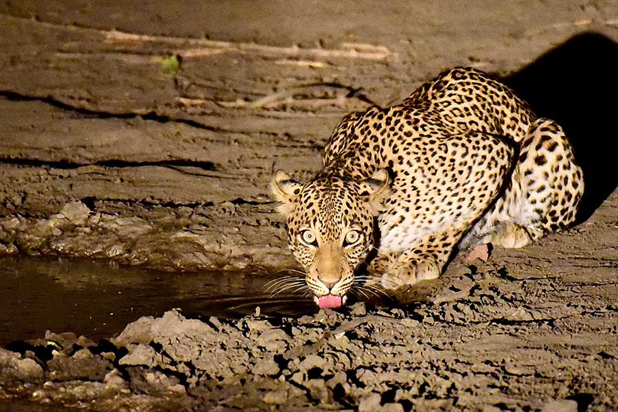 Nestled amidst the wilderness away from the flood plain of the Zambezi River, our next camp became my home away from home for six unforgettable nights, offering a front-row seat to the drama and spectacle of African wildlife. Each day, I sat in our makeshift hide next to the camp’s waterhole—the only water for miles—and watched nature’s theater unfold before my eyes. Over the course of my stay, I was treated to an astonishing 24 leopard sightings, each encounter more thrilling than the last. The elusive cats prowled silently through the shadows, their golden coats shimmering in the moonlight as they navigated their nocturnal domain with unparalleled grace and stealth.